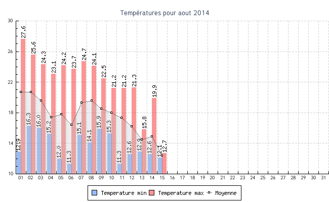 | 01 | 12.9 °C | 27.6 °C | 20.7 °C | 0.8 km/h (14.5 km/h) | SO |