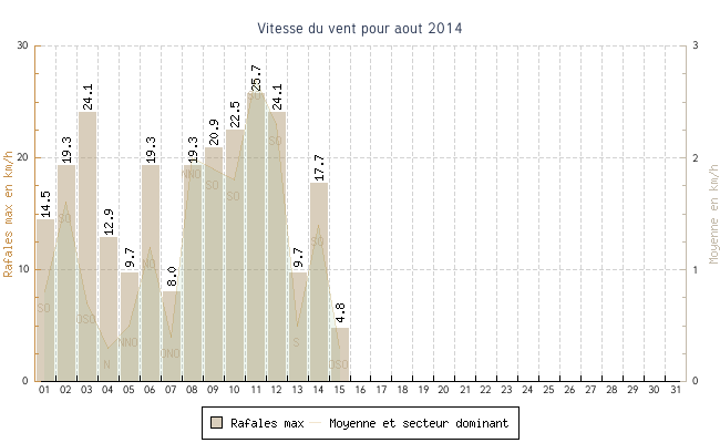 | 08 | 14.1 °C | 24.1 °C | 19.6 °C | 2.0 km/h (19.3 km/h) | NNO |